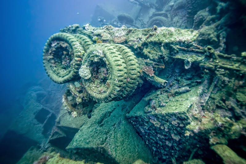 Una vez que la guerra terminó, todo ese material militar fue arrojado al mar. Los ingenieros de la marina de guerra conocidos como Seabees construyeron un embarcadero y condujeron los jeeps, los carros, y las niveladoras al mar. Sesenta años después, esas armas se han convertido en un arrecife artificial notable y rico. En los vehículos abandonados hay corales rojos y amarillos vivos y la vida crece alrededor de ellos.
